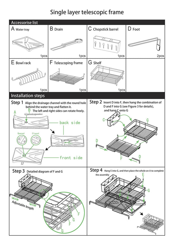 *Adjustable Extension Feet: The drying rack over sink features 2 expandable feet, easily accommodating different sinks. The built-in fence ensures secure drying of large stuff on the rack and prevents them from tipping or sliding into the sink. (Tip: Please make sure the width of your sink is less than 53cm before purchasing in case of incompatibility.)