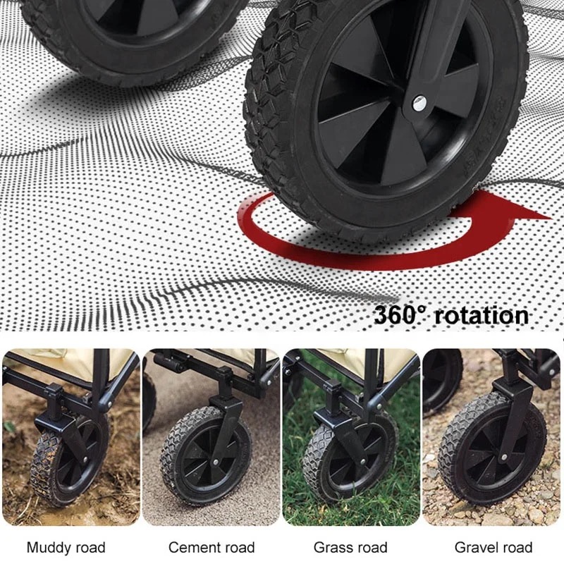 Built with a powder-coated steel frame, it’s strong, stable, and rust-resistant, supporting up to 60kg. The PU-coated 600D Oxford fabric is water-repellent and tear-resistant for long-lasting durability. Equipped with 360° swivel wheels, it glides smoothly across sand, grass, gravel, and uneven ground.