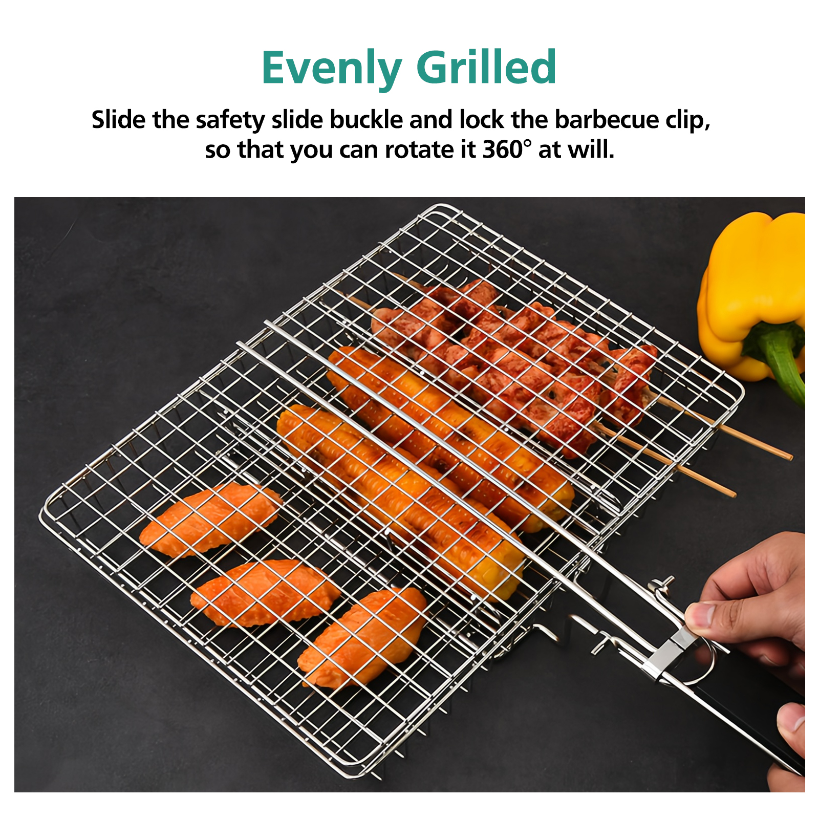 Even Grilling – Secure locking clip allows 360° rotation for evenly cooked food